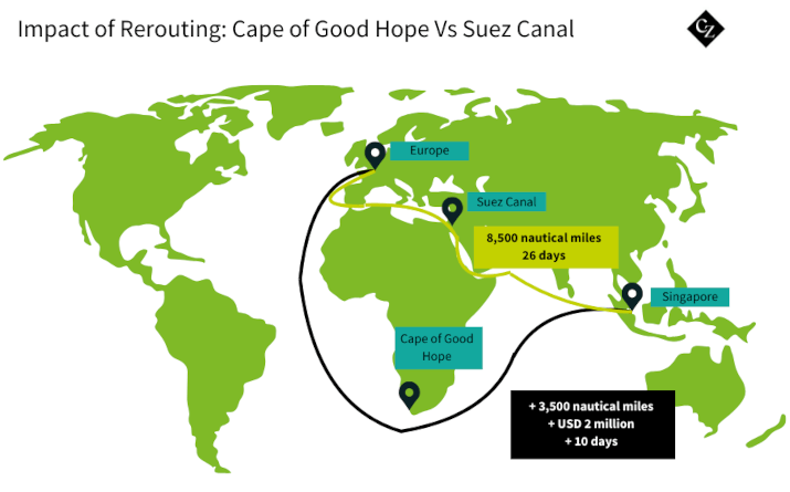 - Operational costs: Rerouting can add between $2 million and 4$ million USD per voyage in fuel and crew expenses. [17]